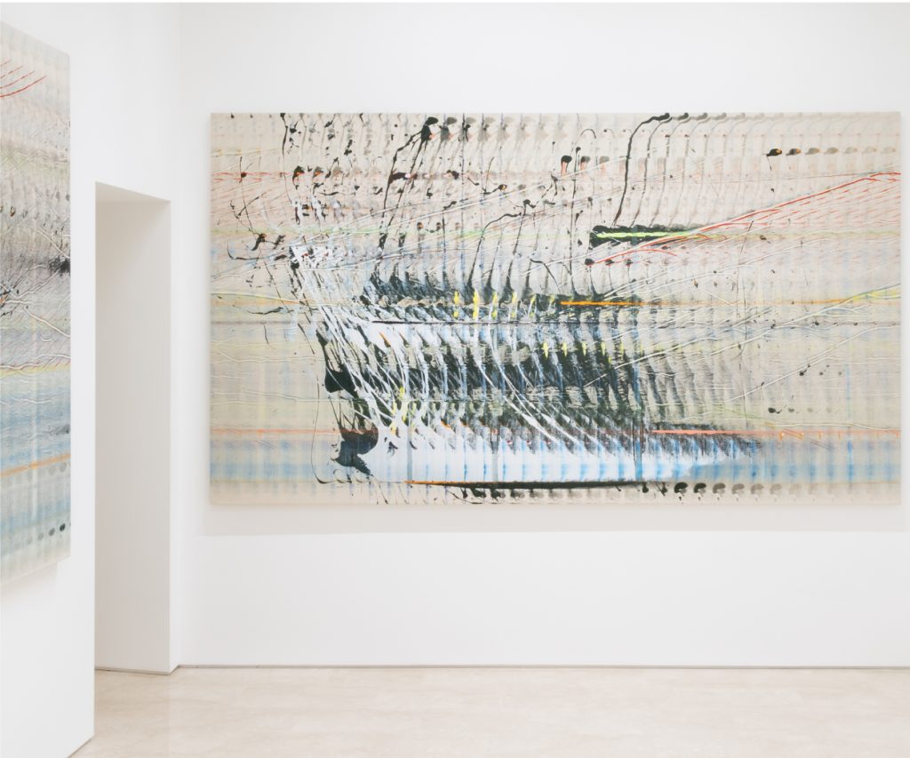 Affrontando le limitazioni di spazio imposte dal suo studio durante la formazione al Royal College of Art di Londra, Kraus ha ideato un’ingegnosa struttura simile a una gabbia per realizzare dipinti su larga scala. Un dispositivo singolare con montanti che fungono da rulli, attorno ai quali viene avvolta la tela grezza e al cui interno Kraus lavora applicando la pittura sia sui rulli stessi che sulla superficie della tela. Mentre quest’ultima viene trascinata attraverso la struttura, la pittura si diffonde e si dispiega, dando vita a schemi visivi che si ripetono, ma continuano a modificarsi.