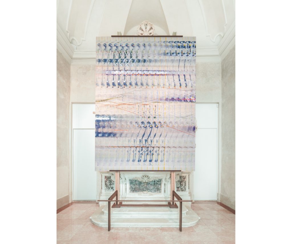 Da lontano, si potrebbero persino riconoscere le frequenze ondeggianti e i ritmi di uno spartito musicale. Dopo aver rimosso il dipinto dal meccanismo, Kraus scuce con attenzione la tela e la tende nella sua forma finale.